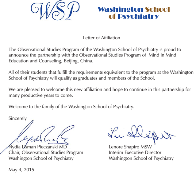 麦德参照美国华盛顿精神病学学院观察性学习项目的结构、工作方式与评定标准。学员完成婴儿观察、幼儿观察、理论、工作讨论四部分的训练,并满足评定标准的,将有机会被美国华盛顿精神病学学院认可为该学院同一个项目的毕业生,成为其会员。